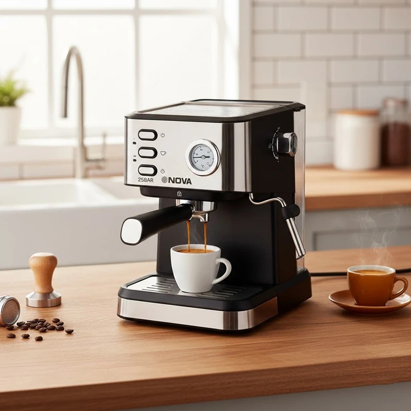 اسپرسو ساز 1700 میلیلیتر نوا مدل NCM-147 EXP یک دستگاه نیمهاتوماتیک خانگی است که برای علاقهمندان قهوه حرفهای طراحی شده است. این دستگاه با توان 2200 وات، فشار بخار 25 بار و بدنه آلومینیومی تلاش میکند تجربهای مشابه با دستگاههای نیمهحرفهای ارائه دهد. تمرکز اسپرسو ساز 1700 میلیلیتر نوا مدل NCM-147 EXP بر استخراج یکنواخت، بخاردهی قوی و استفاده آسان، آن را به گزینهای مناسب برای مصرفکنندگان خانگی تبدیل کرده است؛ مصرفکنندگانی که میخواهند کیفیتی نزدیک به کافیشاپ را در خانه تجربه کنند.